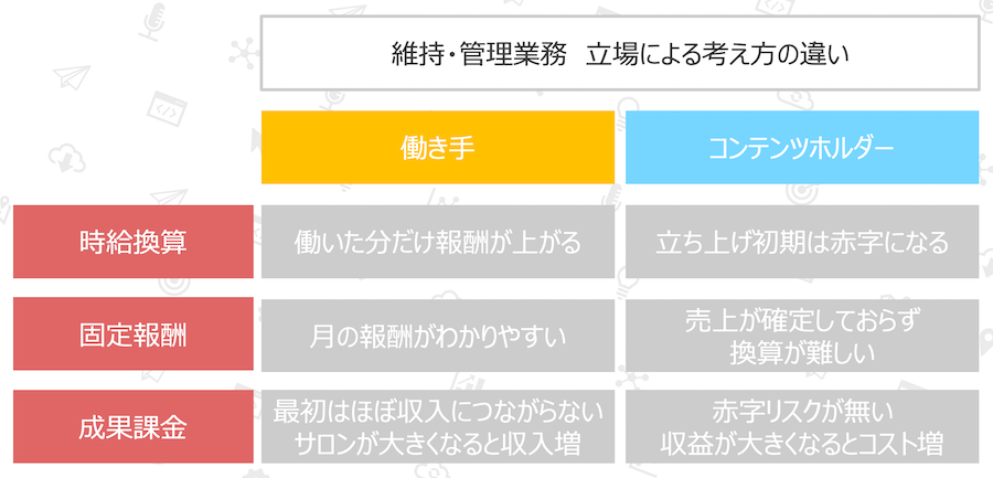 それぞれ、働き手/コンテンツホルダーの立場による違いを挙げると