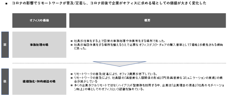 リモートワークの普及/定着により、オフィス需要が低下している。多くの企業がフルリモートではなくハイブリッド型勤務を採用する中、企業は「企業理念の浸透」「社員のモチベーション向上」の場としてのオフィスという認識を強めている。