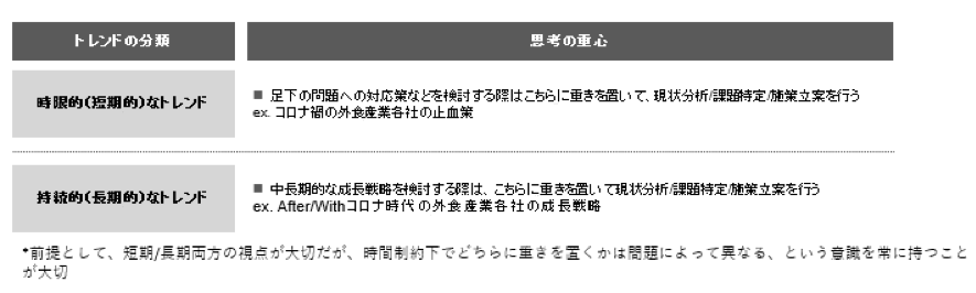 中長期的な成長戦略を考える場合、時限的なトレンドよりも持続的なトレンドに分析の重心をおいて課題特定・施策立案を行っていく必要があるでしょう。
